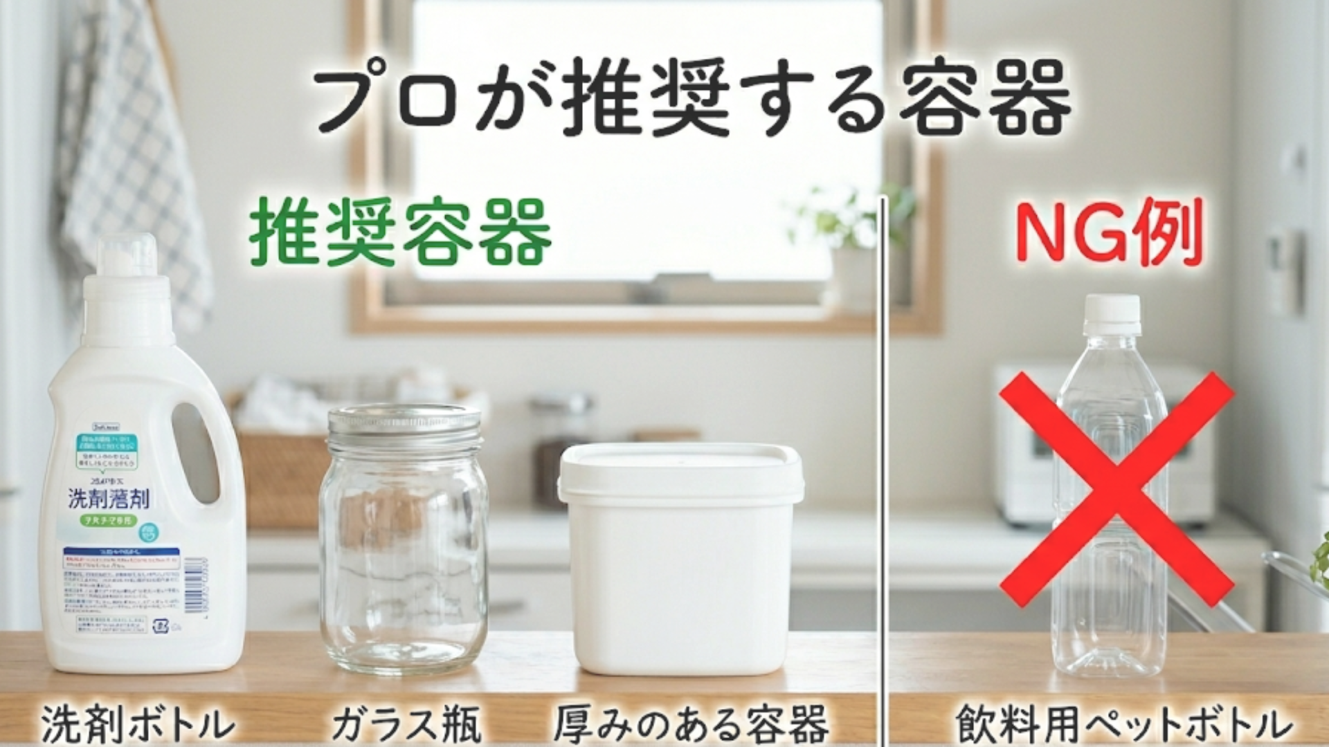 「どんな容器でも中身が入ればいい」と思われがちですが、実は洗剤の品質を保ち、長く安全に使い続けるためには、容器選びにもプロならではの基準があります。