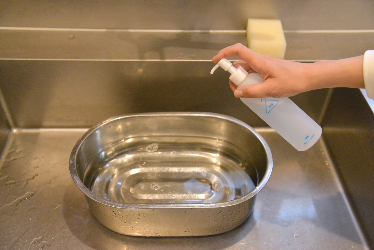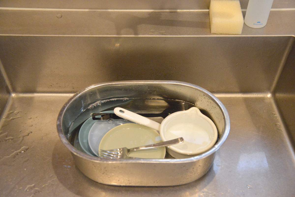 食器を浸け置きをしておきるう場合、お湯を張った桶の中に海をまもる洗剤をワンプッシュ入れることで、油汚れがお皿から剥がれ落ちやすくなります。