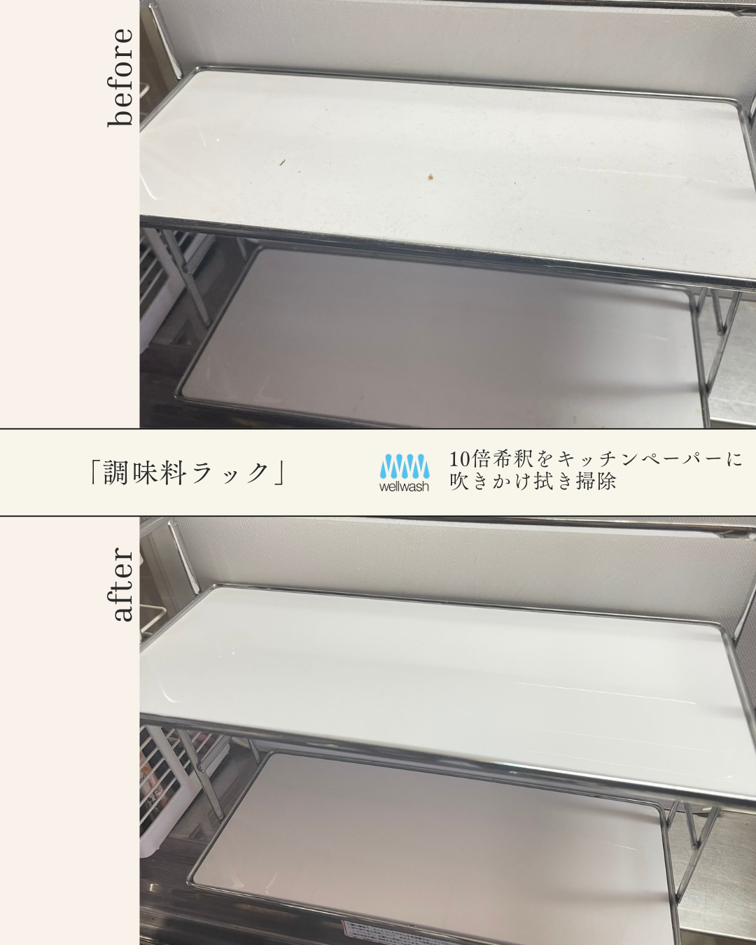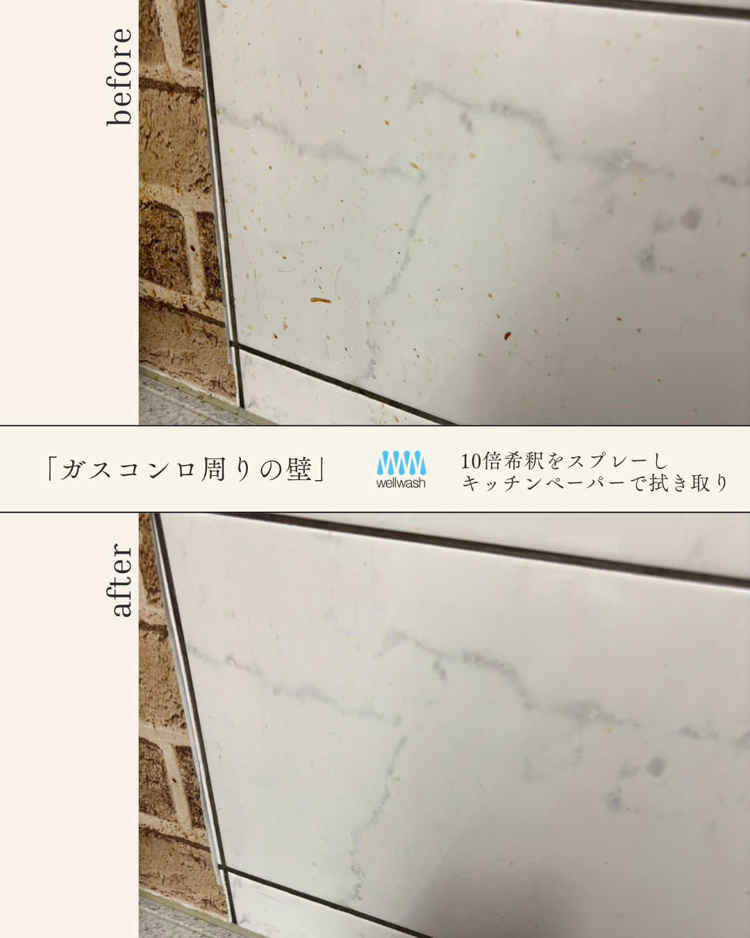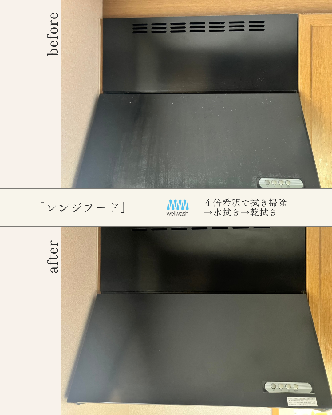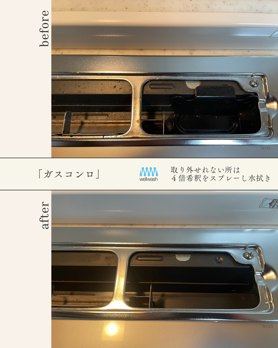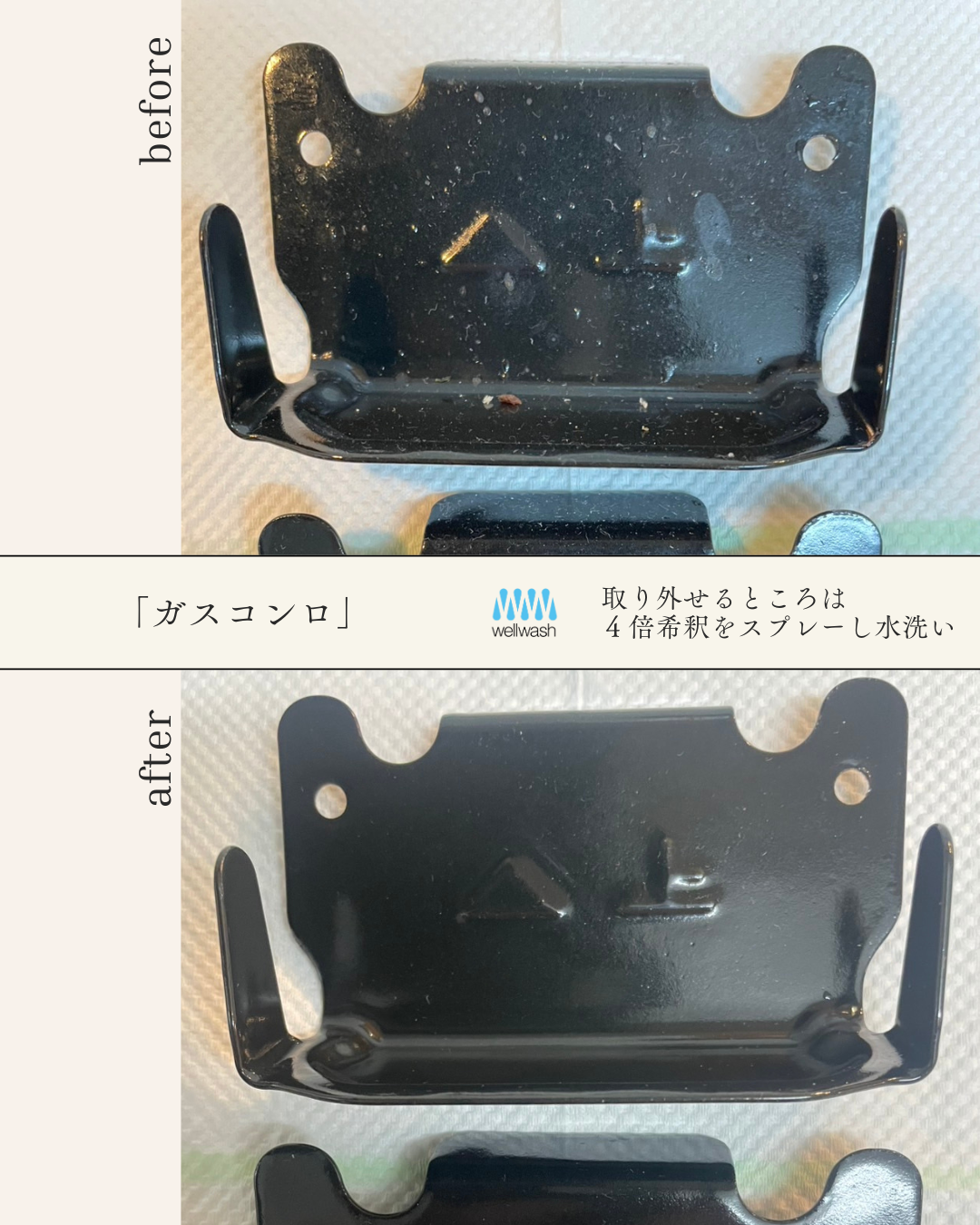 コンロ周り、レンジフードなど、がんこな油汚れの場合には、4倍に希釈したおそうじ用洗剤をオススメします。