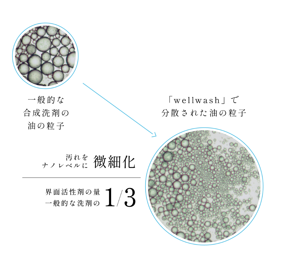 wellwash 海をまもる洗剤は、ナノ粒子分散洗浄を採用し、皮脂を包み込みながら分散。界面活性剤を通常の1/3量に抑え、衣類にも環境にもやさしく汚れを除去します。