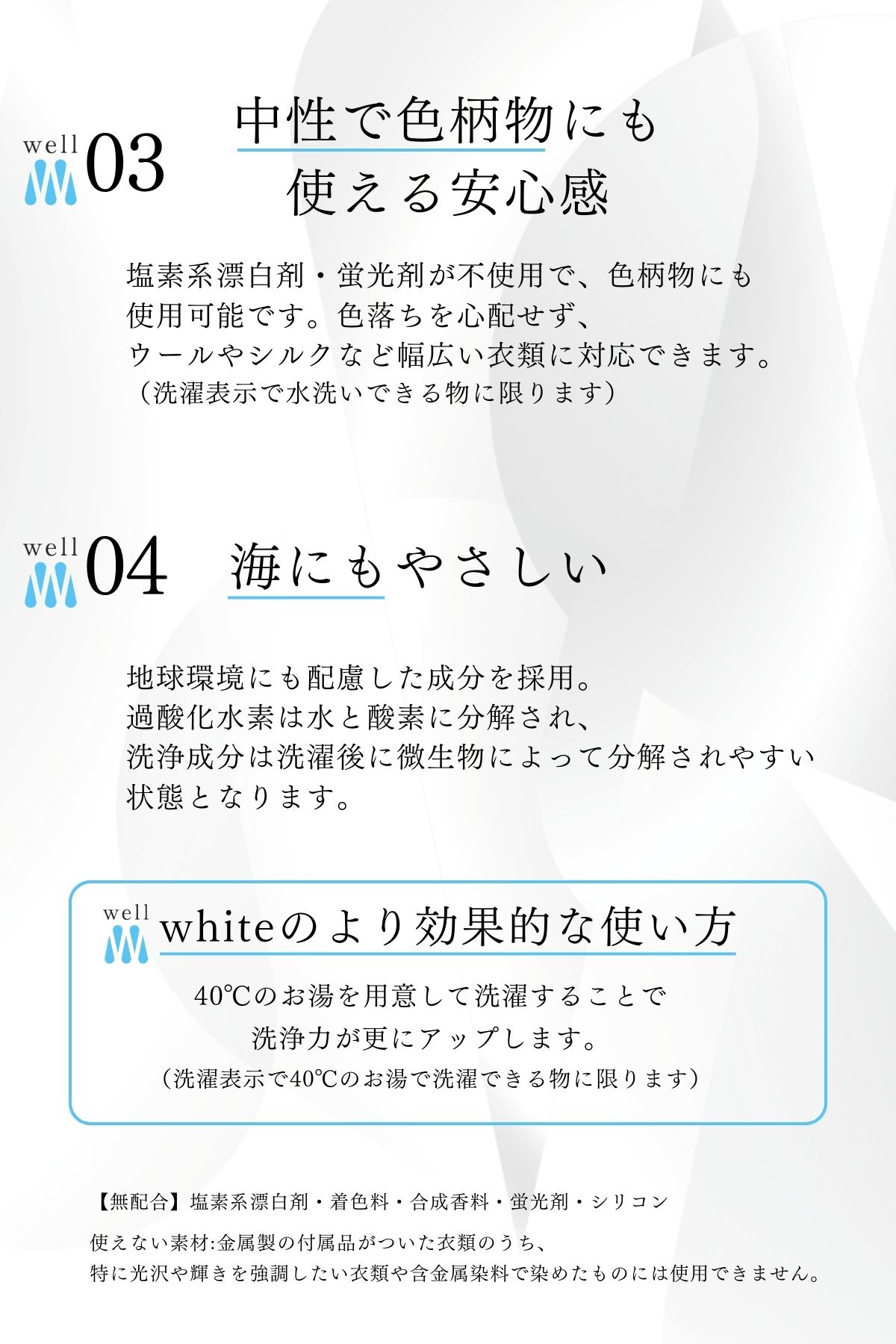 「wellwash White」は高い洗浄力を持ちながらも、衣類・肌・環境にやさしい成分で作られています。